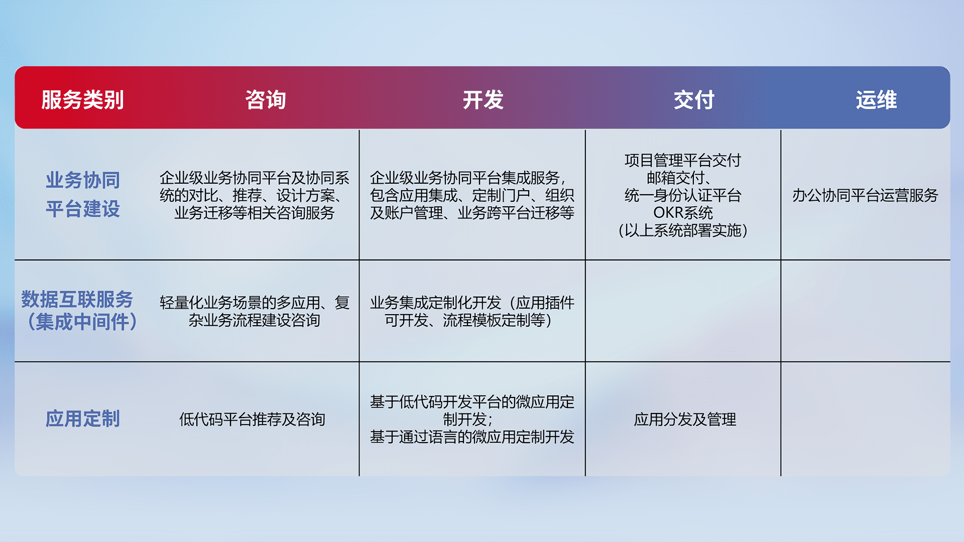 针对钉钉、、、、企微、、、、IDaas等平台级产品提供产品的规划、、方案、、交付、、定制化开发等服务,,,实现如统一协同办公、、、智能客户服务、、、混合会议管理、、、智能数据查询、、、等业务场景,,,实现数字化转型。。。。