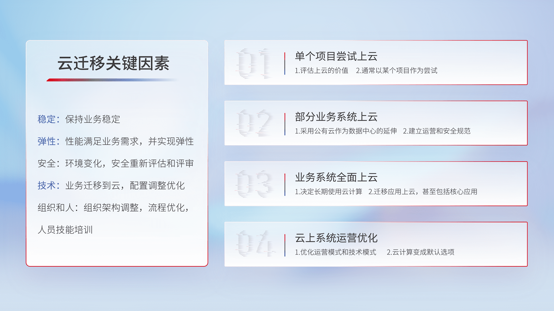 结合实际业务,,从规划设计、、、云平台选型、、云原生改造、、数据迁移、、集成交付,,,迁移全过程为客户识别最佳上云路径,,,做好风险识别管理,,,,设计网络架构、、、、身份权限、、、安全审计合规、、、操作审计、、、日志审计、、监控告警策略、、、、多站点容灾设计等,,,,对云上基础设施进行整体规划,,提升IT治理水平,,,,以满足弹性、、高可用、、、高性能的需求。。。。