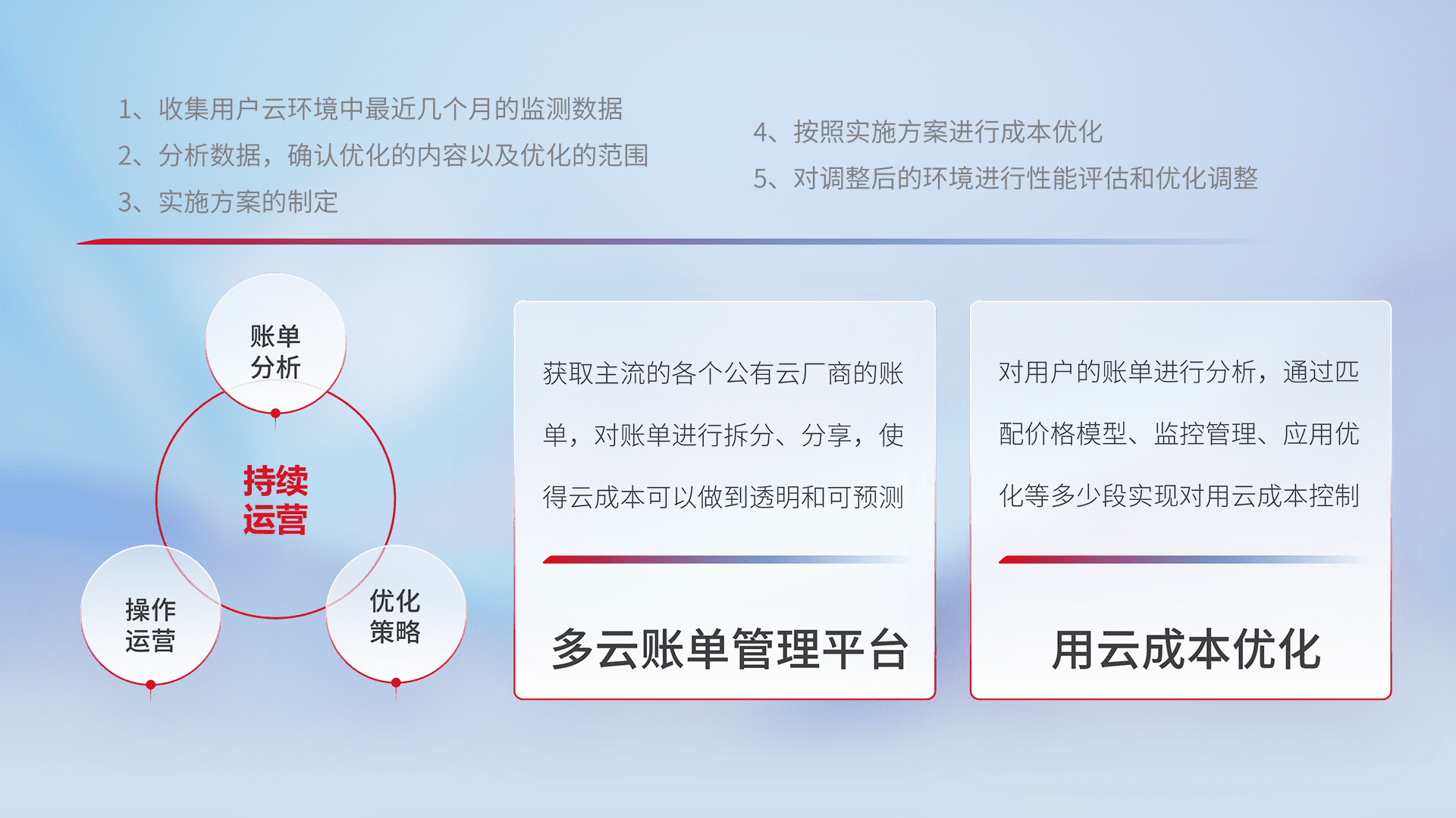 通过多云纳管,,,以统一的资源数据模型把客户的云资源进行抽象和封装,,,,进而实现对多云资源的统一操作,,,保障云资源管理的可靠性、、、、稳定性与可用性。。量身定制化运维内容,,,配置、、、、开发运维、、、补丁管理、、、、备份、、、、监控、、认证和访问管理、、审计和日常巡检等,,保障在用云过程中的可靠度,,,,稳定度以及高可用率。。。