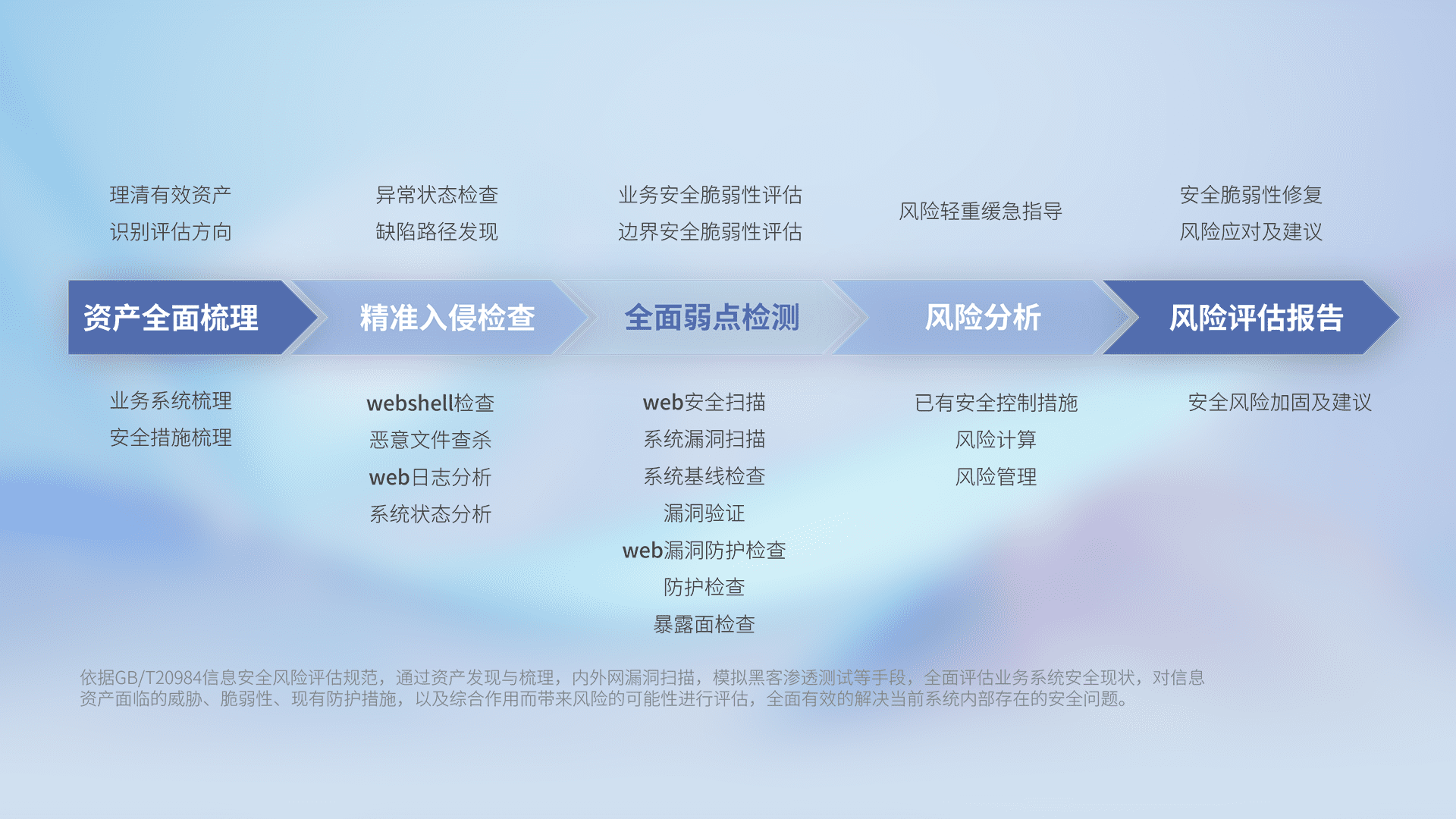 针对客户行业特性,,,,以专业的安全服务+多厂商联合解决方案提供专属的一站式安全管理服务,,,,帮助客户全面感知网络空间威胁,,,基于识别、、检测、、分析、、、防护、、、、监测、、、响应的服务理论模型,,,,从方案咨询、、、集成交付、、、、评估验证、、、、优化加固、、运维运营,,,,致力于为客户提供完整的闭环管理式安全服务。。以实战经验为客户打造高抵御风险的安全体系,,,,帮助客户发现威胁、、对抗威胁、、、处置威胁,,不断积累安全对抗能力,,,,持续保障数字化安全。。